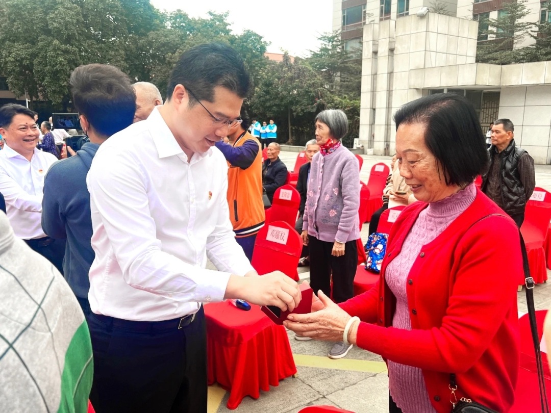 长安镇党委副书记戴浩平、新安社区负责人等为现场200多名符合条件的长者颁发高龄奖励礼品。