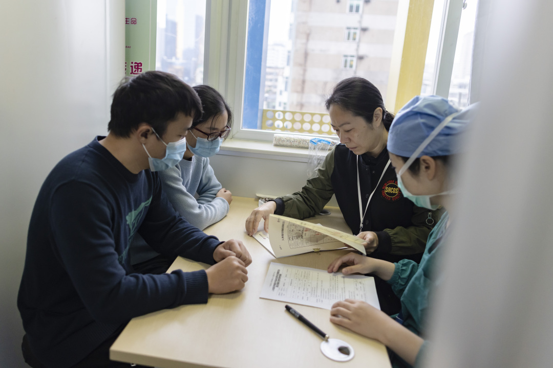 红十字会器官捐献协调员和爸爸妈妈核对捐献相关文书