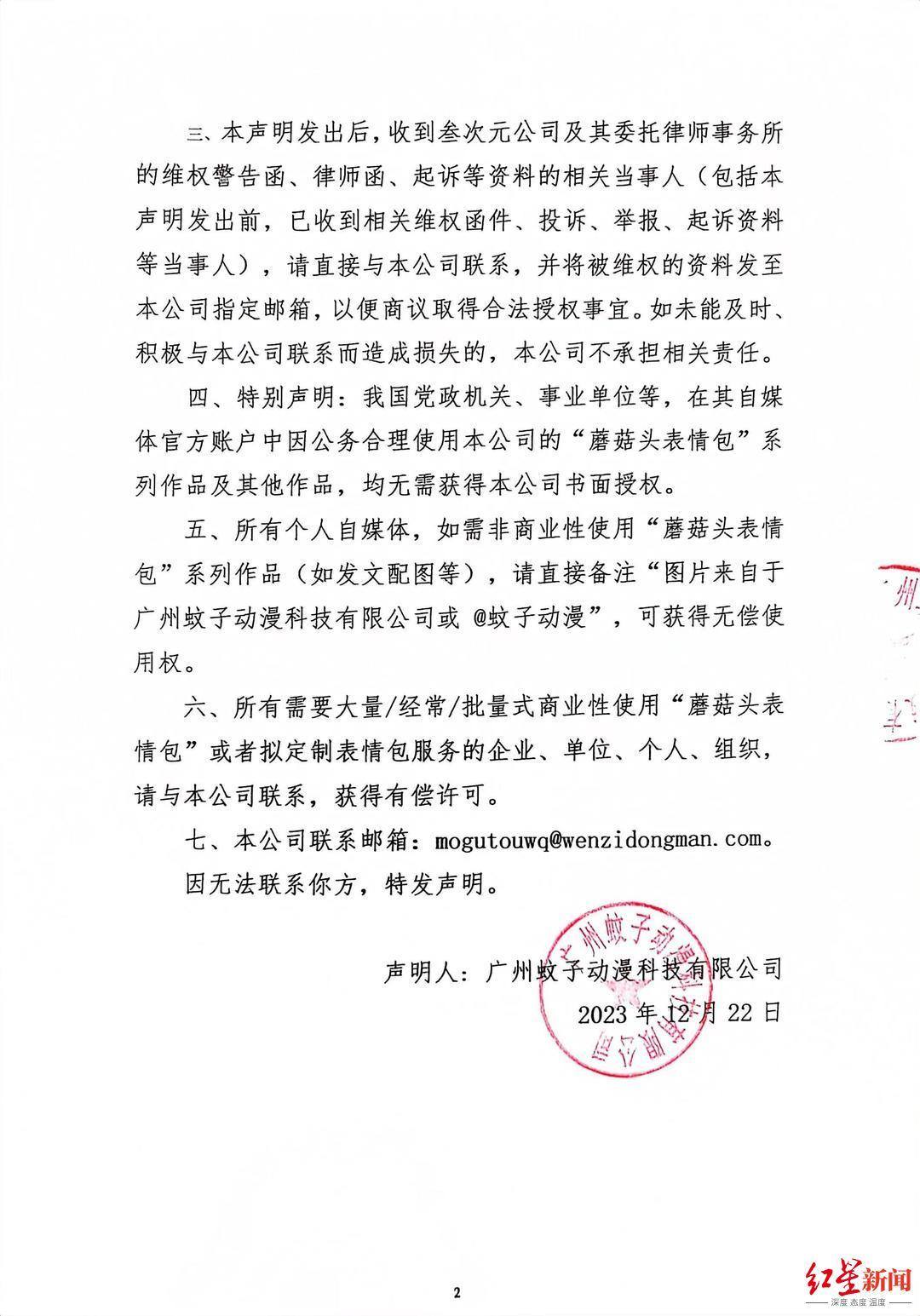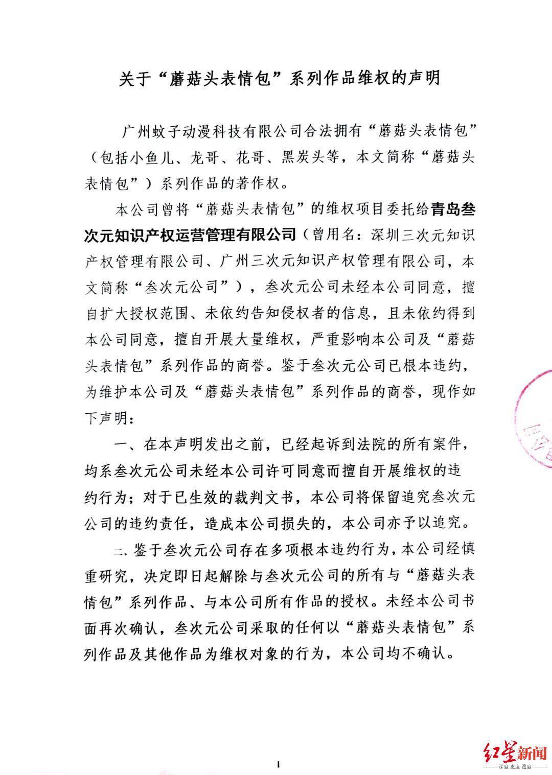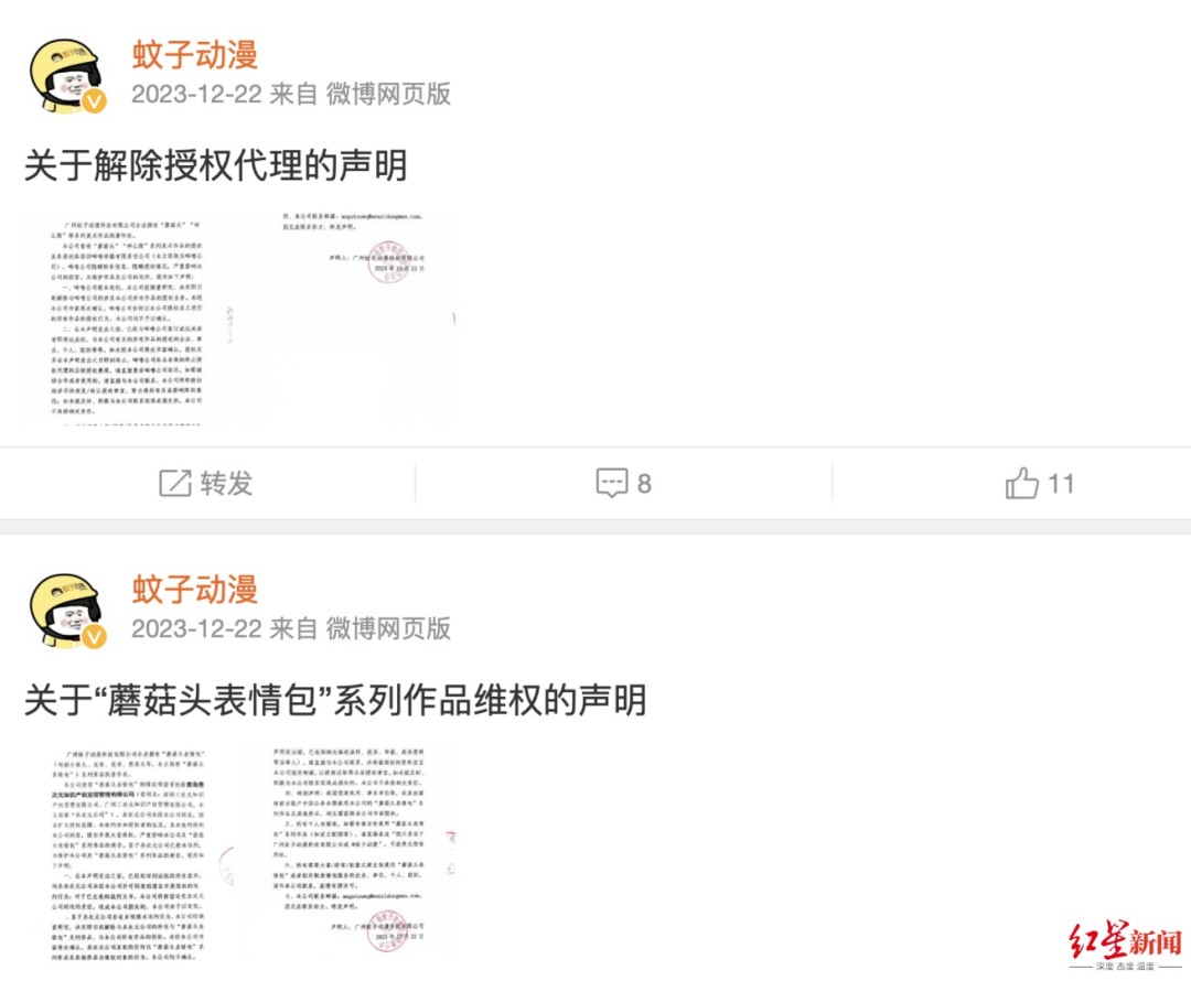 ▲蚊子动漫公司发布关于“蘑菇头表情包”系列作品维权的声明