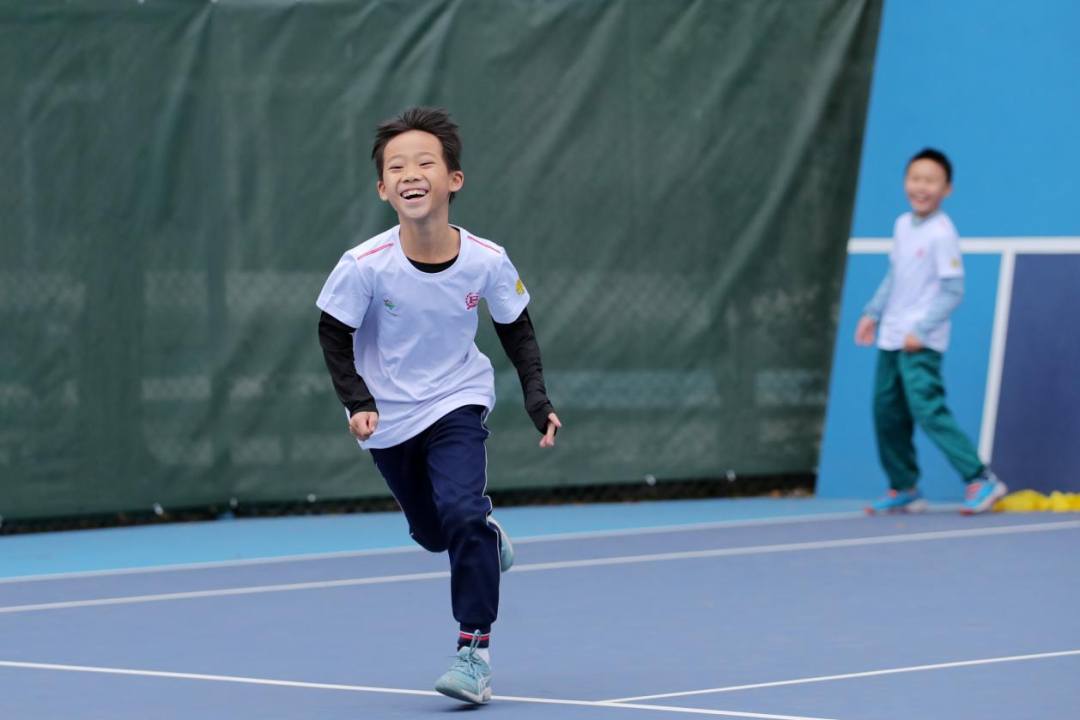 网球小将在球场上快乐奔跑。