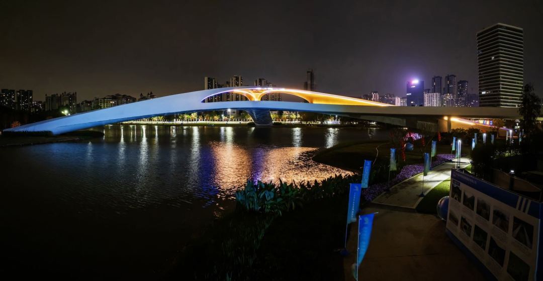 聚星桥设在蕉门河与乌洲涌交汇处,该桥造型新颖独特、优美,三岸起拱相互支撑成桥,飞跨三岸,在夜幕下跃动的曲线光带与繁星天幕亮起,汇聚成为蕉门河上的闪耀新星。桥梁采用120°对称的三段梁拱组合,横跨两河汇流之处,以最短距离连通三岸。同时桥体形成浪漫舒适的水上休闲空间,桥身旋转曲线交织形成“未来之窗”,象征着粤港澳大湾区三地携手,共创美好未来。
