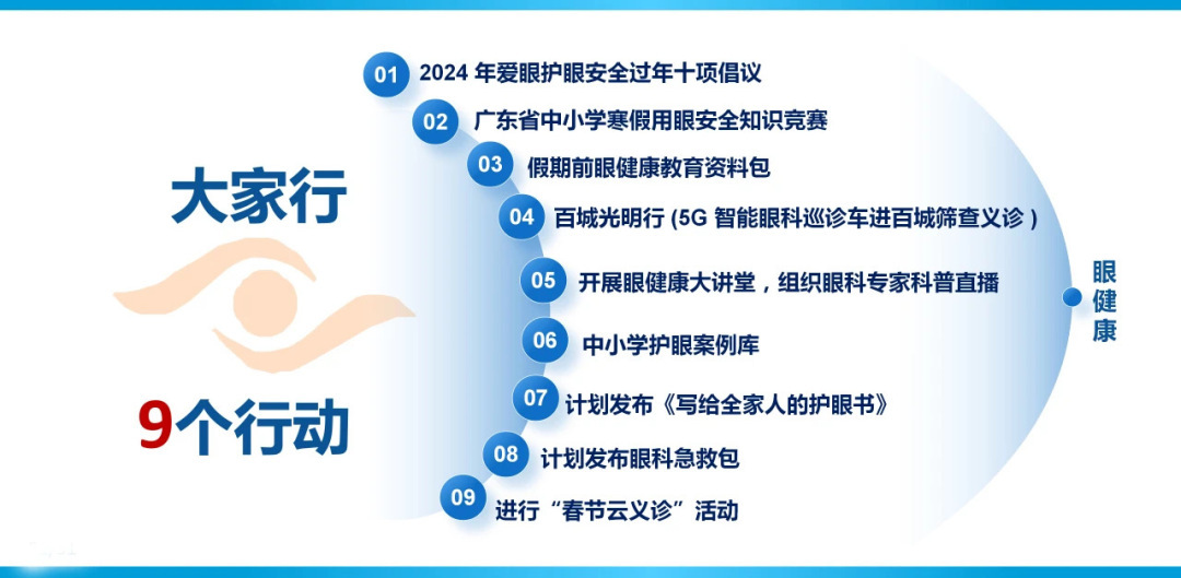 启动会由中山眼科中心党委书记李强主持。会上,中山眼科中心主任、医院院长林浩添介绍,此次发布的“大家行”系列活动内容丰富,包括联合眼科学课程思政案例库编委发起2024年爱眼护眼安全过年10项倡议,“来自全国31家单位的多位专家共同发起‘2024年爱眼护眼安全过年十项倡议’,从近视防控、燃放烟花爆竹、居家做饭、聚餐饮酒、游戏娱乐、户外旅游、体育运动、交通出行、宅家追剧、正确就医等10个方面提出爱眼护眼倡议和科学建议。”此外,还将举办广东省中小学寒假用眼安全知识竞赛、发布眼科急救包等共9项行动,并结合群众的眼健康需求,不断拓展和延伸行动内容,以实际行动在上百个城市上千个学校开展上万场眼健康行动。