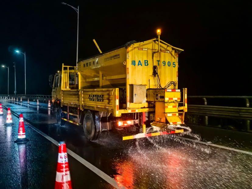 目前,已在京珠北、乐广北高速部分路段,九嶷山隧道至丰阳站路段预防性撒布融雪剂,预防道路结冰。