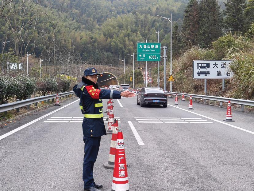 因湖南境内也下雪,广东二广高速丰阳站至湖南永蓝长铺站双向约10公里路段,利用交通锥压缩超车道和应急车道,第二车道可通行。
