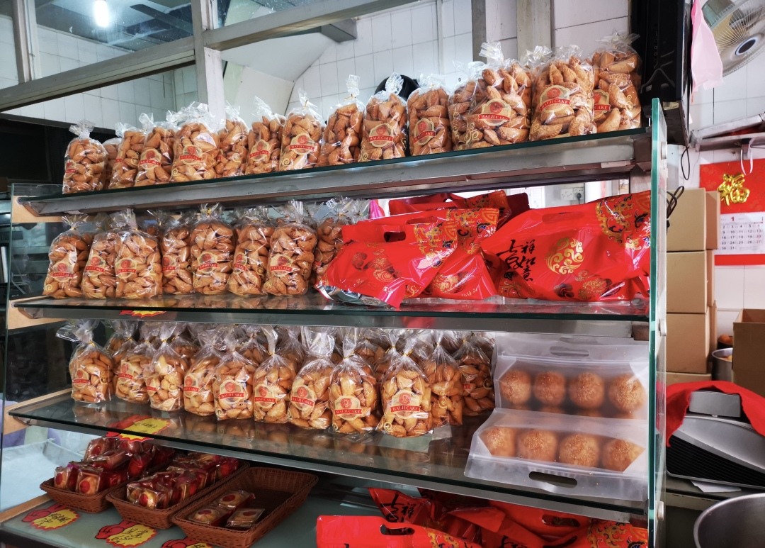 在市莲路52~54号的一家饼店,也在制作煎堆,七八名店员用糯米粉、爆花米揉成粉团,两名厨师用两个油锅炸煎堆。金灿灿的煎堆让人感受到了过年的气氛,有的街坊当场试吃并连声称赞“好香”“好脆”,随后大袋小袋买回家。