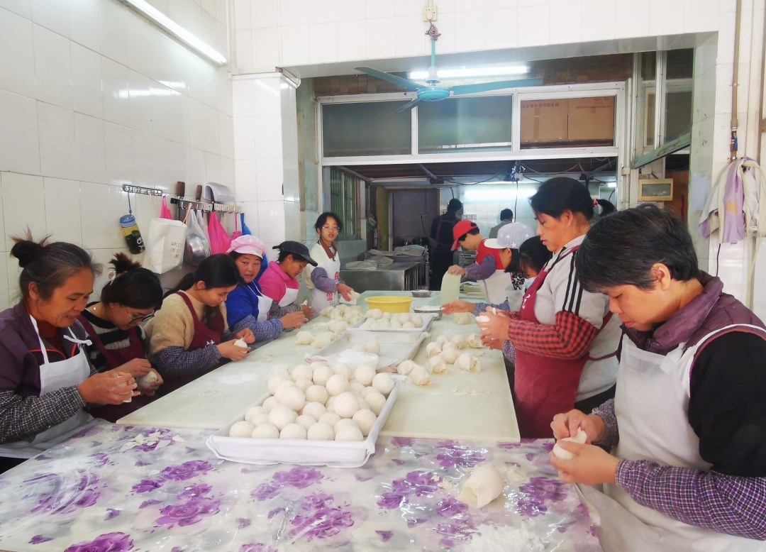 一名厨师正在门口炸煎堆,将一个个用糯米粉、爆花米揉成的粉团放到沸腾的油锅里,约10分钟就从锅里捞出一批金灿灿的煎堆。饼店里面设了一个展厅,展厅里面摆着两大桶煎堆,货架上还有油炸的酥角,来购买煎堆、酥角的顾客接二连三。展厅里面是一间作坊,10多名工人同在一张桌上作业,将糯米粉、爆花米等揉成一个个白色的粉团。