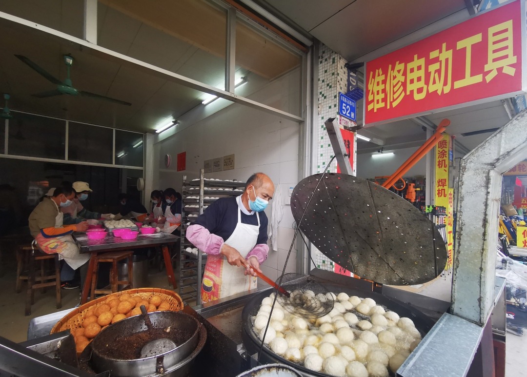 1月21日上午9时多,记者来到大龙街市莲路石岗西村段11号一家饼店,闻到一股煎堆的香味。