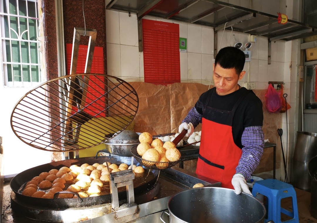 饼店的经营者老胡告诉记者,该店平时制作饼类食品,从农历十二月初一开始就制作煎堆了,设有两处作坊,有传统手工,也有用机器,一天可以制作2万多个成品煎堆。