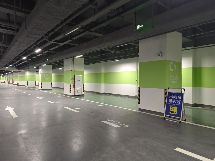 网约车接客区,位于P2普通停车场主通道右侧,设有专属区域供网约车接送客。网约车接客区倡导即停即走、快速接送客人,共设车位15个。