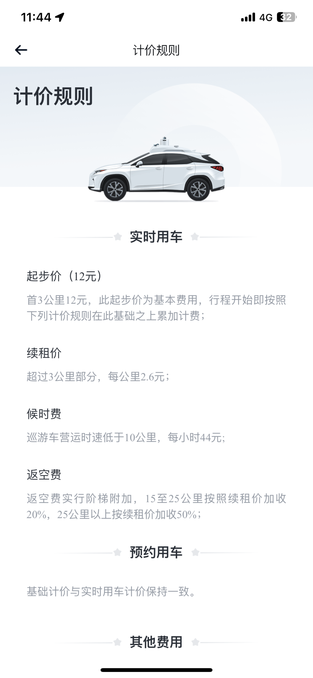 目前,全无人自动驾驶出租车的预约用车与实时用车的收费与市区出租车的收费基本一致,起步价12元,首3公里12元,此起步价为基本费用,行程开始即按照下列计价规则在此基础之上累加计费:续租价超过3公里部分,每公里2.6元;候时费巡游车营运时速低于10公里,每小时44元;返空费实行阶梯附加,15至25公里按照续租价加收20%,25公里以上按续租价加收50%。此外还有其他费用,例如清洁费——若乘客乘车时因个人原因(如呕吐、洒落食物或饮品等)导致车辆脏乱,严重影响乘车环境,需承担清洁费。清洁费金额以双方协商为准。超时等待费暂不收取,但乘客长时间未到达上车点可能导致订单取消。