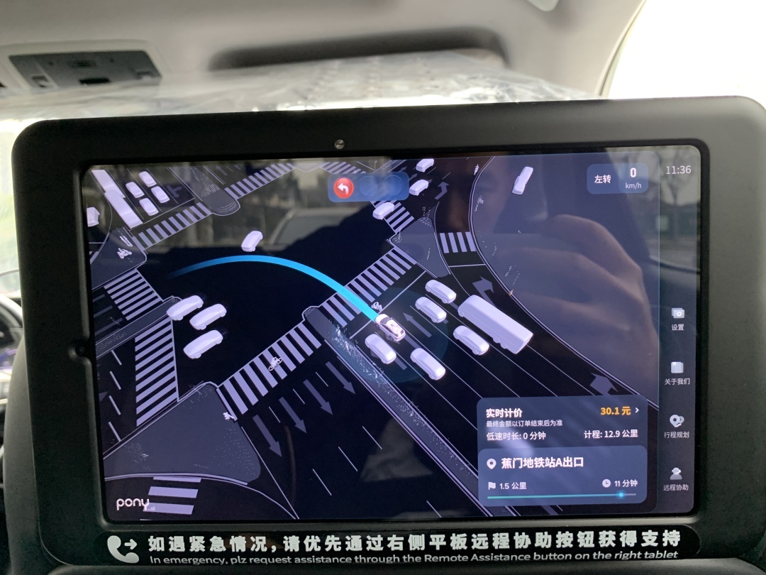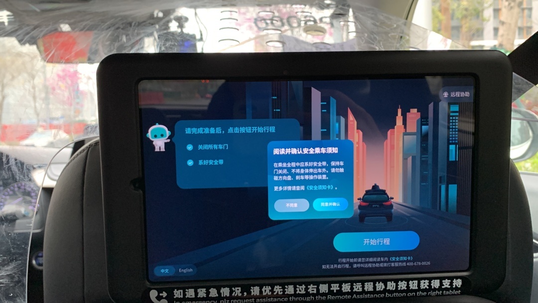 出发前,记者还需要在屏幕上阅读并确认安全乘车须知,并且系好安全带,才能点击“开始行程”。随后,车辆就会按照既定路线向目的地出发。途中可以更改一次目的地。