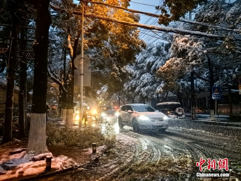 1月22日,湖南省长沙市迎来降雪,城区被白雪覆盖。图为车辆在雪中行驶。