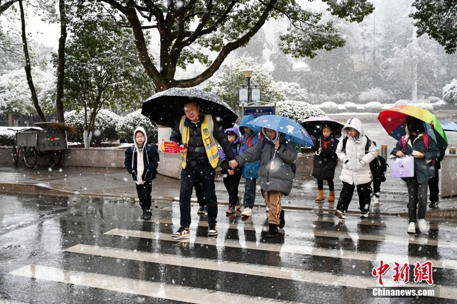 1月22日,浙江省金华市武义县,志愿者冒雪在学校门前护送学生过斑马线。