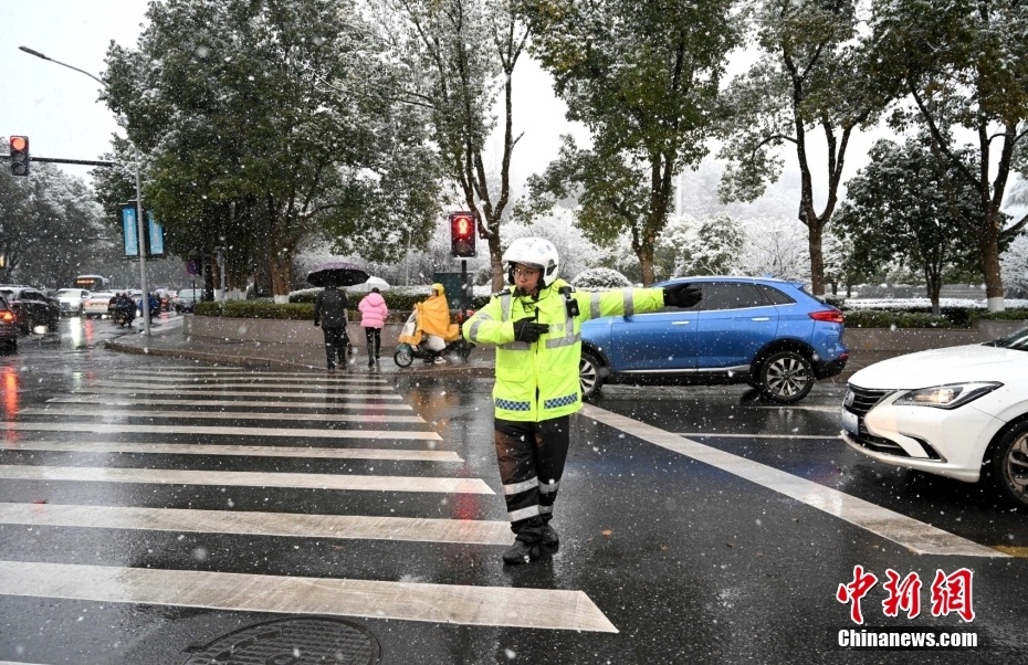 1月22日,浙江省金华市武义县,交警在纷飞大雪中执勤。