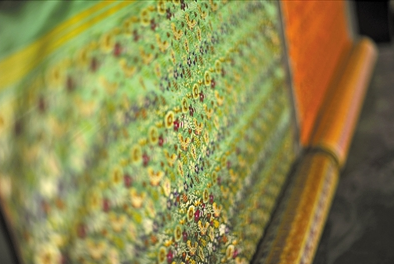 梅玫指出,中国外销披肩主要在广州绣制,全部为正反图案完全一致的双面刺绣,线头巧妙地藏在针脚中,不露痕迹。是由两名绣工在竖立的绣绷两面,在同一纹样部位交替穿针引线。针法主要为平绣、长短针和套针。广绣大披肩尺幅较大,多为80~100公分见方,构图一般是中心对称,纹样设计多采用变形较大的缠枝花和写实味浓的折枝花,如牡丹、大洋花,其间穿插梅花等小花以及叶蔓等,形成花团锦簇、错落有致的视觉效果,彰显着富丽堂皇之姿、丰盈妩媚之态。