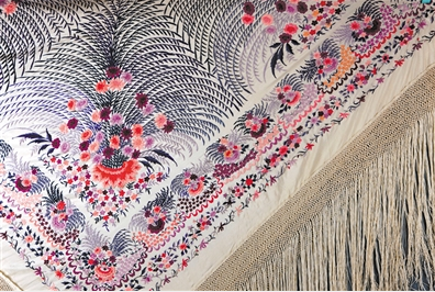 广绣披肩与西班牙服饰文化间的特殊渊源格外值得关注。梅玫指出,19世纪至20世纪初,中国披肩在西班牙及西属殖民地如墨西哥、菲律宾等地的流行程度更胜于欧美其他国家,甚至在19世纪后半期成为西班牙女性民族服装的一个重要组成部分。有的学者认为,中国外销披肩特有的流苏,可能是受到墨西哥披风的穗须影响而来的。19世纪后半期中国披肩上开始流行的浓艳大花,尤其是黑地红花、黑地金花的设计,也十分符合西班牙的审美观。西班牙文化圈将中国披肩的表现力发展到极致,演绎出前所未有的美感。