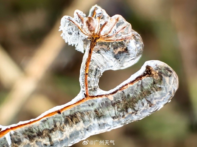 今晨广州气温创下入冬新低。在从化五指山,不少树木枝头都有挂冰现象,在帽峰山,植物叶片和一些建筑的表面覆盖了一层薄冰。