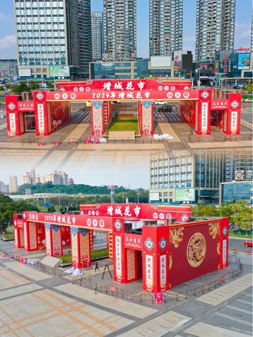 2024年广州增城迎春花市将于1月31日至2月9日在增城广场北广场举行。牌楼门头展示“增城花市”主题,牌楼整体以中国红为主色调,气势恢宏,牌楼的外面设计有金色的龙图案,寓意着吉祥如意,内墙围绕龙年、花市及增城农文旅等元素展开设计,内墙左侧内容为诗意增城、龙年大吉祝福、增城荔枝简介,而内墙右侧内容为福龙贺岁祝福、周末到增城、增城丝苗米。牌楼的内侧则挂满了红色的灯笼,增添了浓厚的节日气氛。增城花市牌楼不仅造型优美,更是一个富有文化内涵的象征,展示着增城地区的传统文化和民俗风情。
