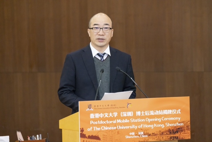 仪式伊始,李学金教授对港中大(深圳)博士后总体情况进行介绍,回顾了博士后流动站的申报历程,对深圳市人力资源和社会保障局为大学争取到流动站政策突破表达了衷心感谢。李教授强调:“博士后流动站是大家的共同平台,期待与社会各界的合作共赢。”