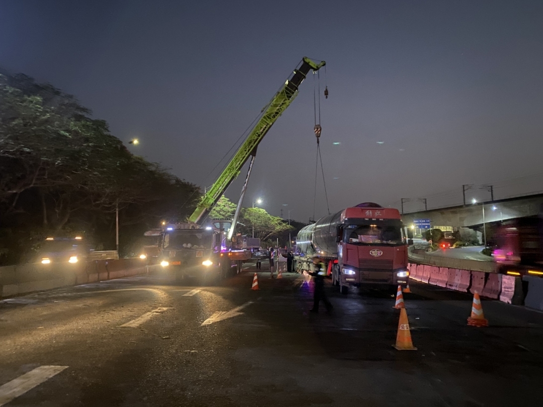 接报警后,交警部门迅速赶到现场处置,对事发路段进行了交通管制,并在现场摆放锥筒,以防途经车辆发生追尾或者拐弯太猛引发二次事故,同时找来吊车进行作业排障。