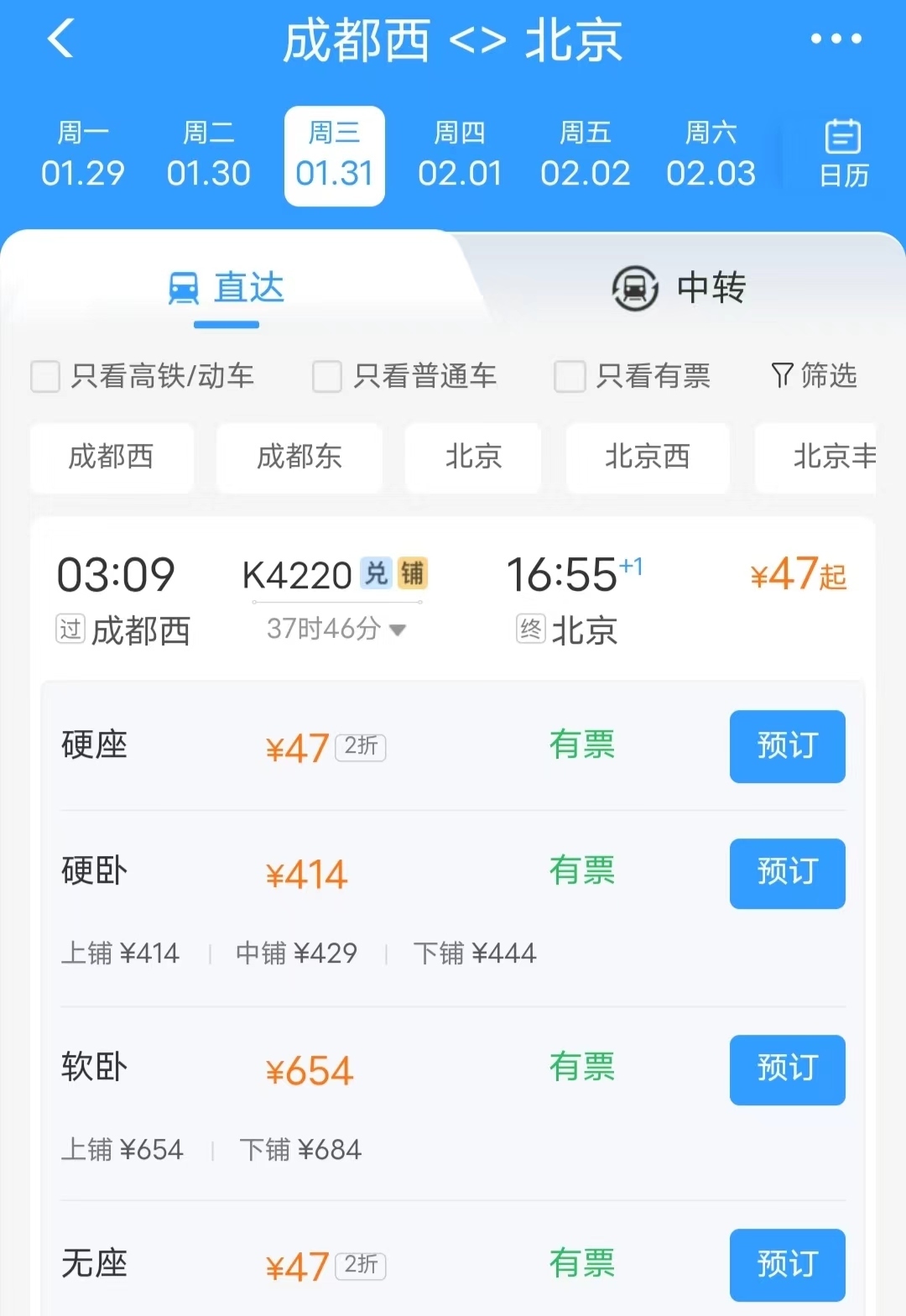 早前还有多名网友晒图称,1月29日由成都西开往北京的列车K4220次,硬座票只需要47元,有关消息一度冲上微博热搜,引起广泛关注。经查,K4220次始发站为眉山站,终点站为北京站,全程37小时46分。1月29日,该车次从成都西开往北京的硬座票打两折,只售47元,不少网友直呼“好便宜”。对此,12306客服人员回应媒体称:“这个票价是准确的,春运期间部分重点方向开行返空车,实施2折硬座票的优惠,满足不同旅客出行的需求。”不过,这趟K4220次列车,成都发车的时间是凌晨3时09分,到达北京的时间是次日16时55分,全程37个小时46分钟,乘车时间相对不友好,耗时也很长。