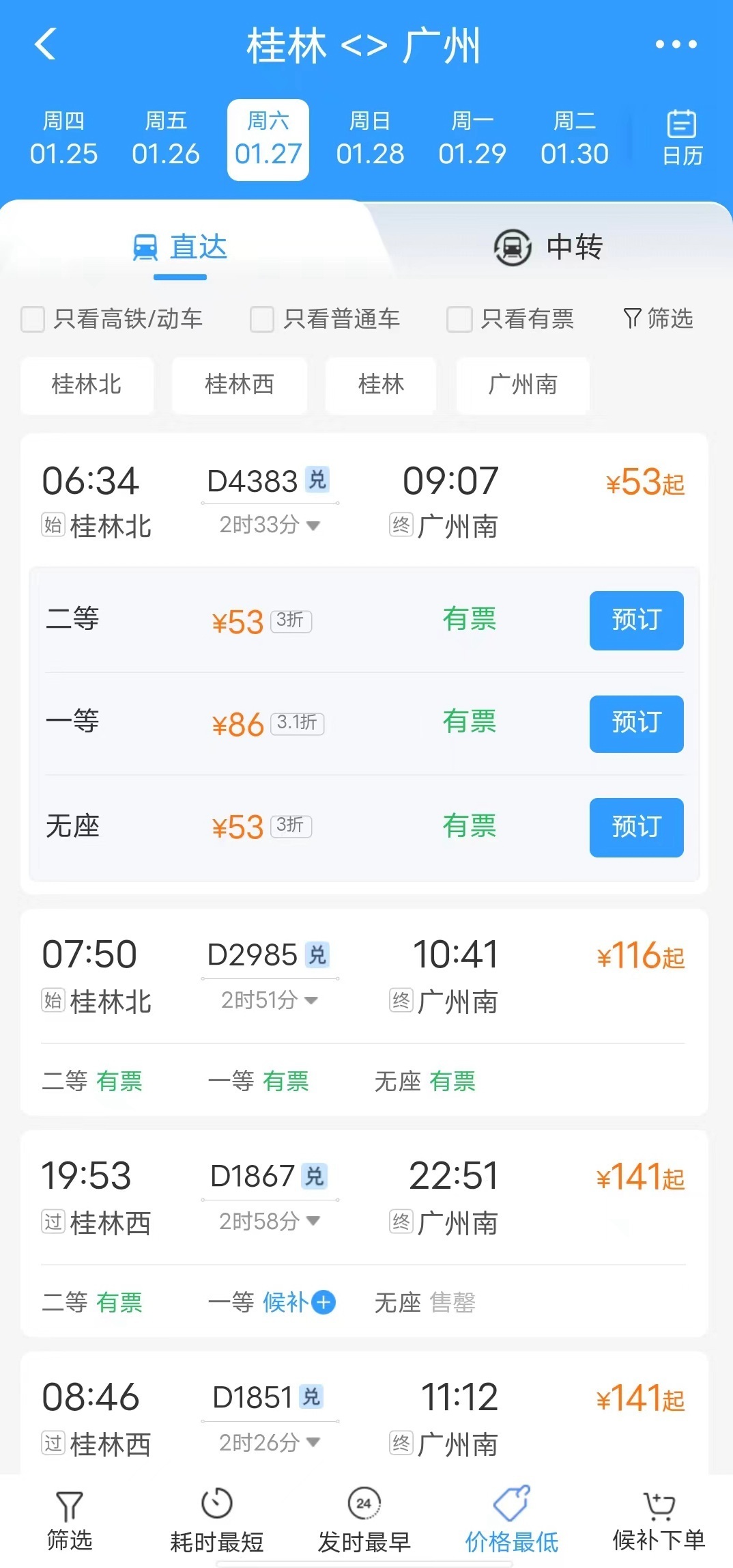其实,148元也不是D4383次的全价,该车次全价为198元,148元车票是打了8.4折,53元则是打了3折。记者今日从铁路12306获悉,春运期间,全国铁路采取增开临时旅客列车、重联动车组、开行夜间高铁列车等方式,在客流集中地区、紧张方向和高峰时段加大运力投放,同时加大票价优惠力度,普速列车票价最低1.9折、动车组票价最低3折,进一步让利于民。12306显示,1月27日到2月2日,桂林到广州的D4383次列车,从桂林北站出发,二等座3折优惠,仅售56元;一等座3.1折,仅售86元。