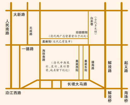 据《广州城坊志》《广州市地名志》等史志记载,卖麻街早在宋代就已存在,有近千年历史。形成街巷前,卖麻街一带是江岸地,相传有织网和麻皮的集市,故而得名。从历史地图上看,南宋末年,这个卖麻集市当时很可能在江边的沙洲或小岛上,有人在上面做织网、麻袋、麻绳的买卖,目标客户就是渔民,这算是一德路一带最早的商业活动了。