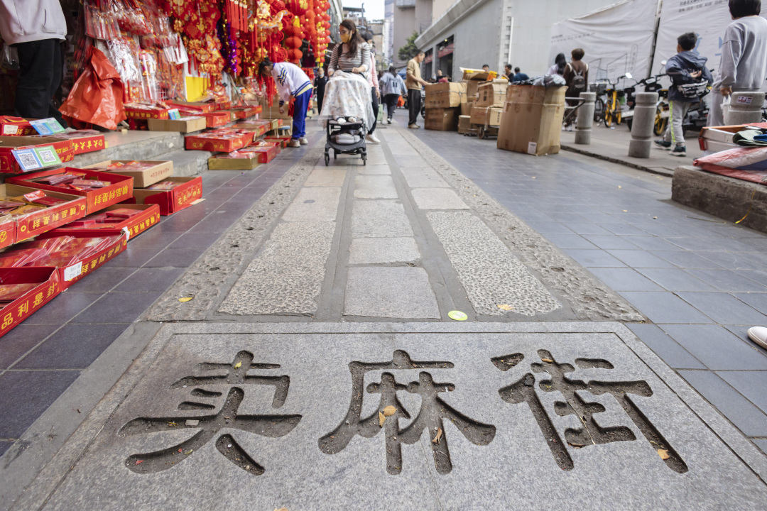 从一德路地铁站B口出来,眼前就是一条热闹街巷。路面不宽,入口处的路面石板上,“卖麻街”三个大字却表明其年代久远。街道只有约250米长,两旁有很多小商铺,铺子里有海味干货、海鲜河鲜,也有凉果干货,还有家常美食,烟火气十足。有意思的是,卖麻街上并没有卖麻品的铺子。这是为什么呢?原来,早期这里确实是麻品集市,只是后来逐渐演化为海味干果一条街了。