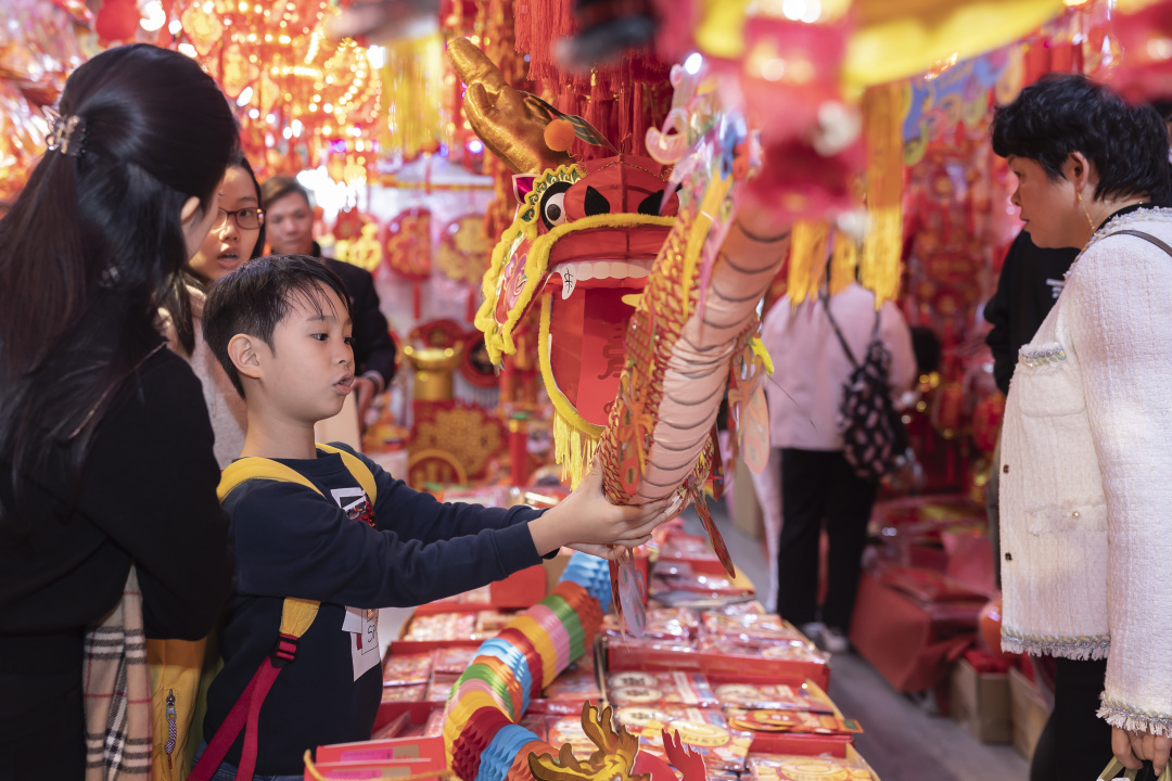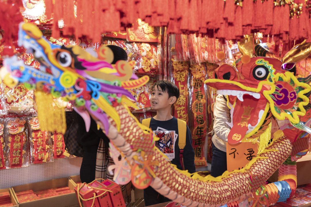 出了万菱广场,再往前走,就是德宝交易市场,但见一抹抹“中国红”连成一片,红灯笼、春联、中国结、龙年挂饰、福字,还有一沓沓利是封……看上去十分喜庆。