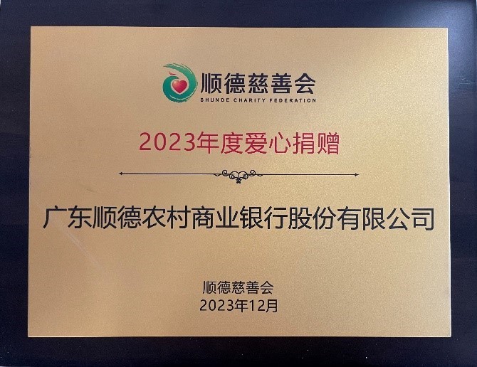 顺德农商银行被授予“2023年度爱心捐赠”牌匾