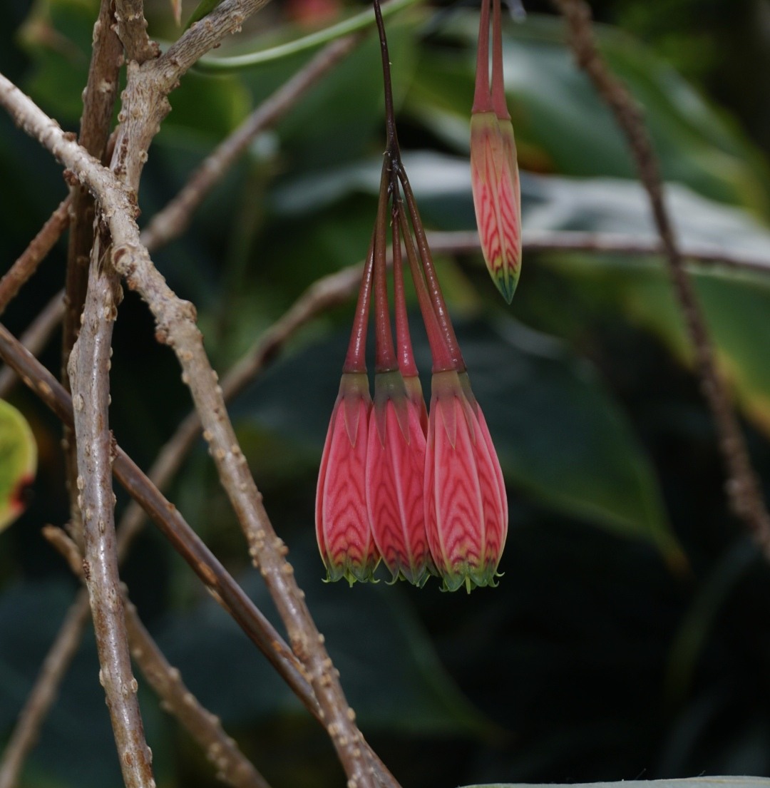 近期正在开花的是近无柄树萝卜,“近无柄”是指它的叶柄较短或无。不留心很容易错过近无柄树萝卜精致少见的小花。未开放时为黄绿色,毫不起眼,绽放时却高调地转变为鲜艳的红色,且具有深红色V型横纹,规则得像是人为画上去的一样。更为精巧的是,其花冠先端短短的裂片偏偏被“涂”上了翠绿色,花开时外卷,像极了少女跳舞时的裙摆。