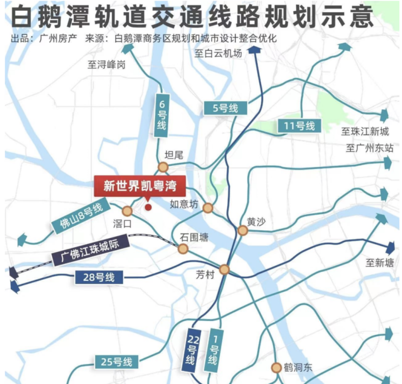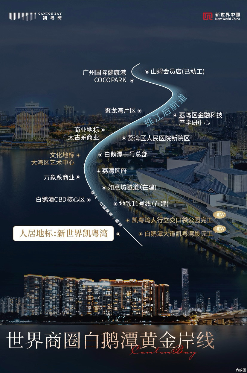 崛起中的世界级商圈白鹅潭,正在成为一个时代的目的地。交通全面铺开:白鹅潭大道、如 意坊隧道、地铁11/22号线等项目正加速链合。其中,地图上全新亮相的白鹅潭大道为白鹅潭 CBD含金量最高的核心地段,沿路皆城市重要节点与标志性工程,其开通,精确界定白鹅潭第一圈层。人居地标新世界凯粤湾,白鹅潭第一圈层首席高品质大盘,与商业地标太古系、M1级重奢商业万象城、文化地标白鹅潭大湾区艺术中心集成白鹅潭第一圈层地标圈,鼎立江岸头排,领衔广州下一个十年最具生命力的珠江岸线。