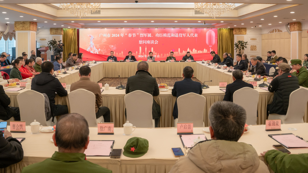 1月25日,广州市2024年春节烈军属、功臣模范和退役军人代表慰问座谈会在广州大厦举行,来自11个区的30多位烈军属、功臣模范和退役军人等代表参加,市政府、广州警备区领导出席座谈会。
