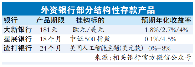 在短期(1年内)结构性存款产品方面,大新银行一款181天结构性存款产品的年化收益率分为三档,分别为1.8%、2.7%和4%;星展银行的18个月结构性存款产品年化收益率最低为0.1%,最高可达4.5%。