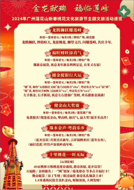 据了解,2024年广州莲花山新春桃花文化旅游节以“金龙献瑞·福临莲峰”为主题,深挖新春节庆优秀内涵,将岭南新春民俗文化以文艺表演、互动活动、地道美食等新颖、活态的方式融入旅游节庆中,创新升级景区节庆文化产品、文旅业态,让传统文化“活”起来,带动旅游“火”起来,不断培养可持续发展的新春节庆文化品牌价值,为番禺区文旅融合高质量发展贡献力量。