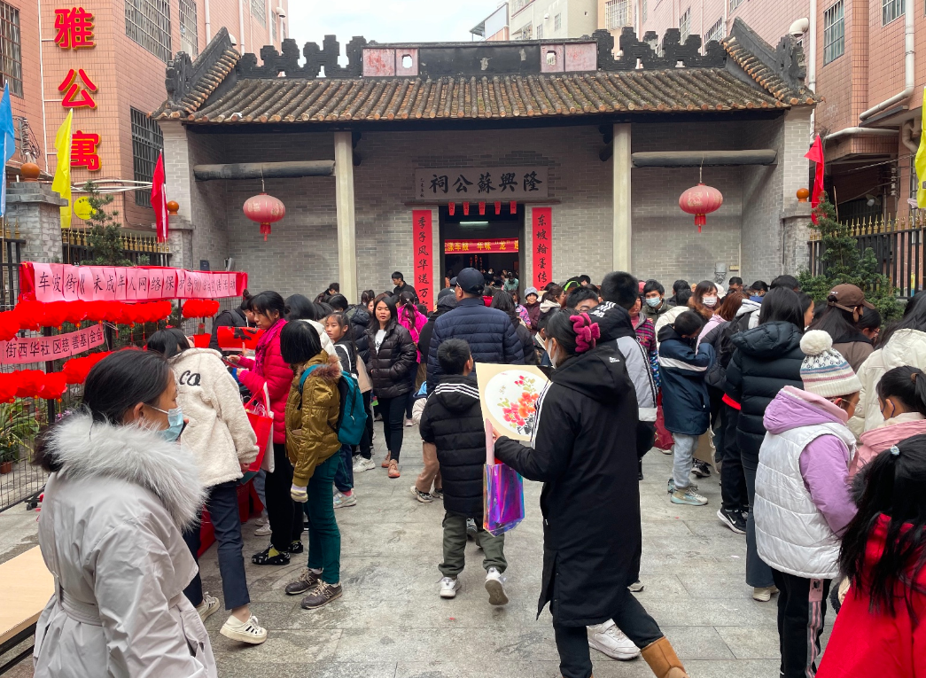 1月23日,车陂村隆兴苏公祠里传来了孩子们阵阵欢笑声,西华社区联合车陂小学开展了“花漾车陂年味‘龙’”系列活动,小朋友们和家长一起包油角、做炒米饼等传统过年食品,还有书画老师到场为街坊送“福”。新春将至,年的味道已经从祠堂满溢而出。