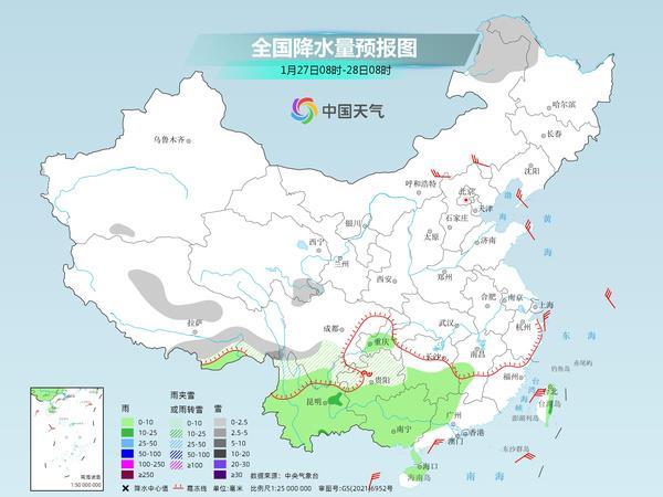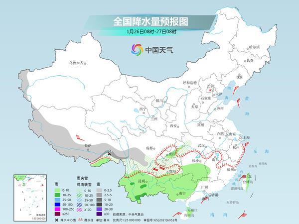 中央气象台预计,今天,新疆南疆西部山区、西藏西部和南部、四川盆地东南部、贵州西北部、云南北部等地的部分地区有小雪或雨夹雪,局地有中到大雪。云南中南部、贵州南部、湖南南部、华南北部和西部等地的部分地区有小到中雨。