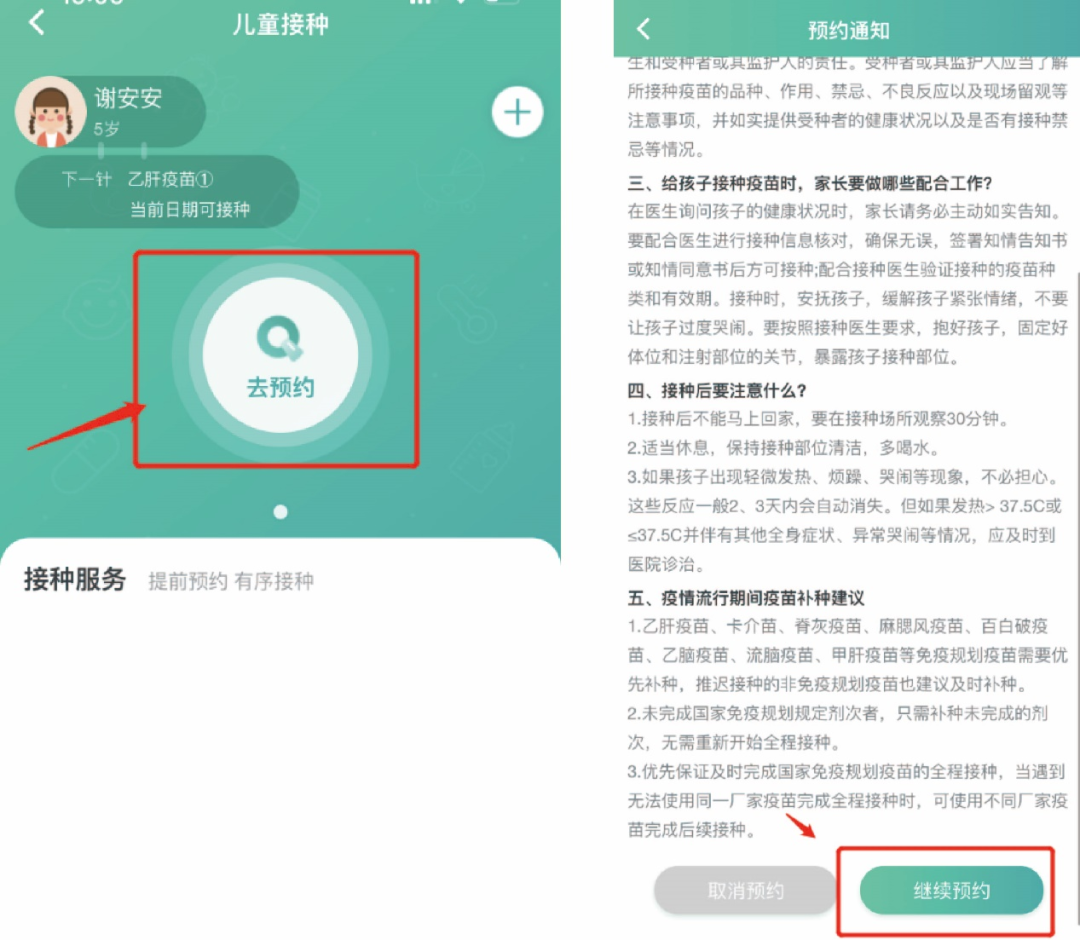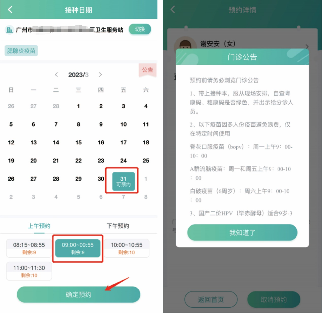 第四步 选择接种日期和时间段,点“确定预约”,预约成功后跳转预约详情,弹窗显示门诊公告。