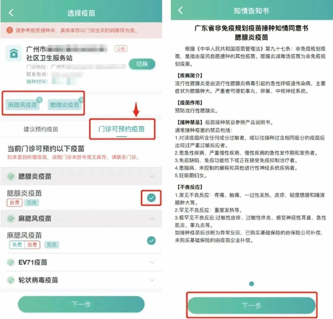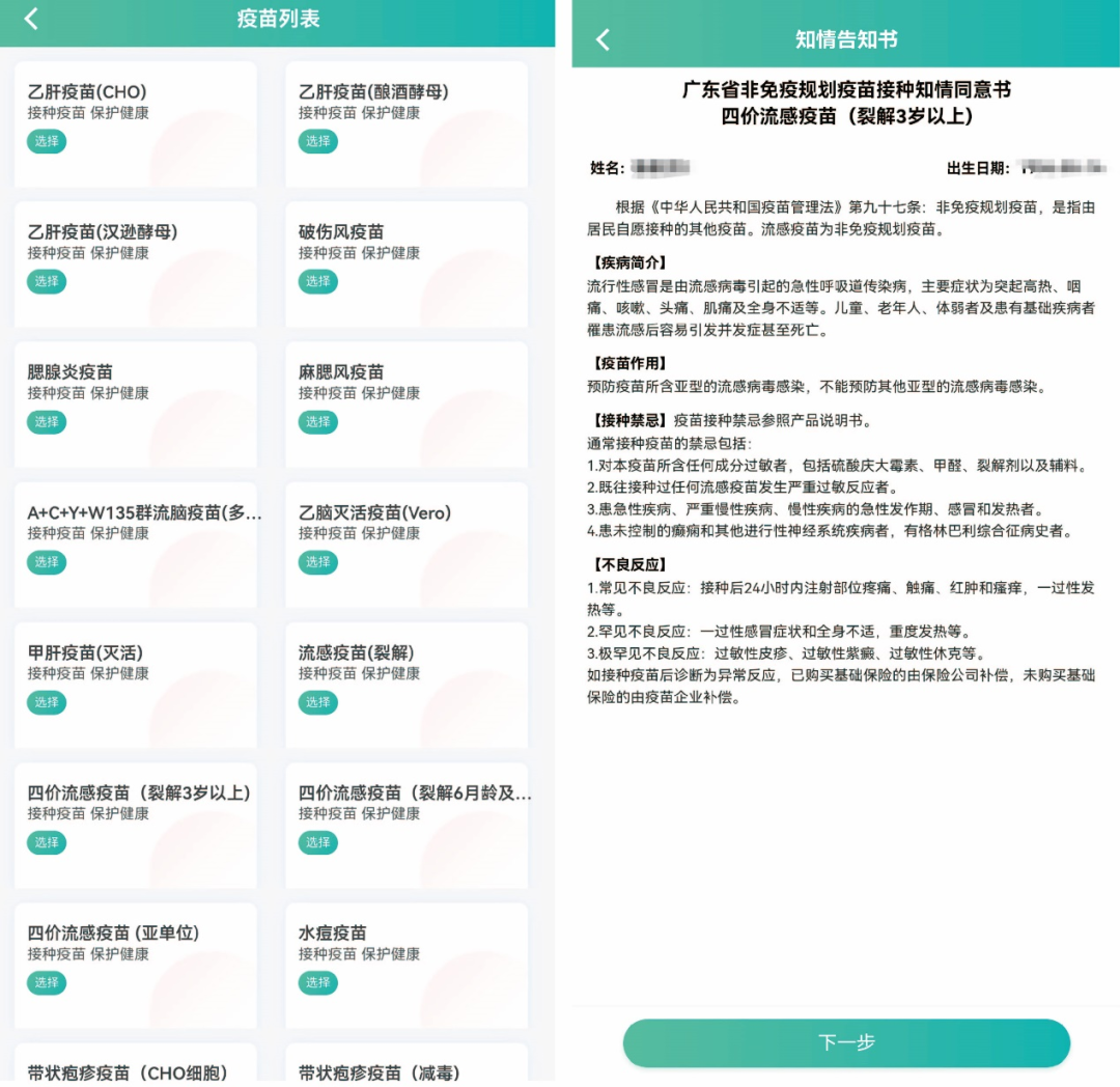 第三步 选择需要接种的疫苗,查看知情告知书后点击“下一步”。