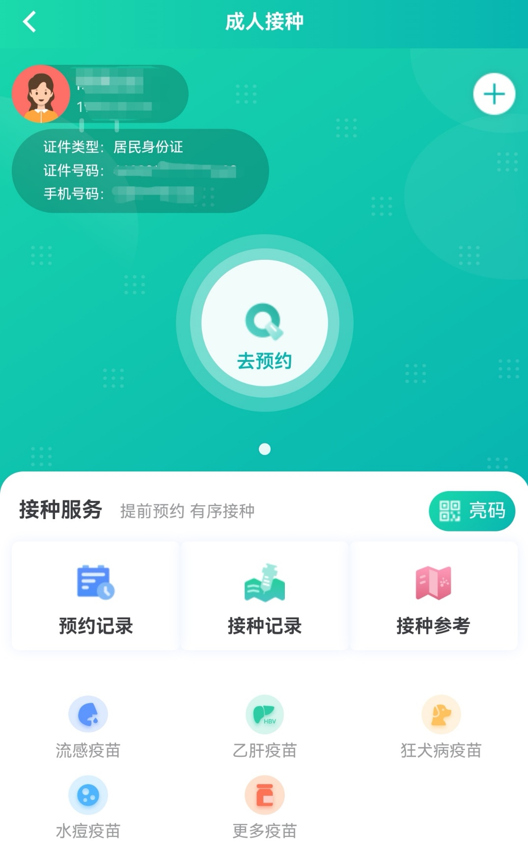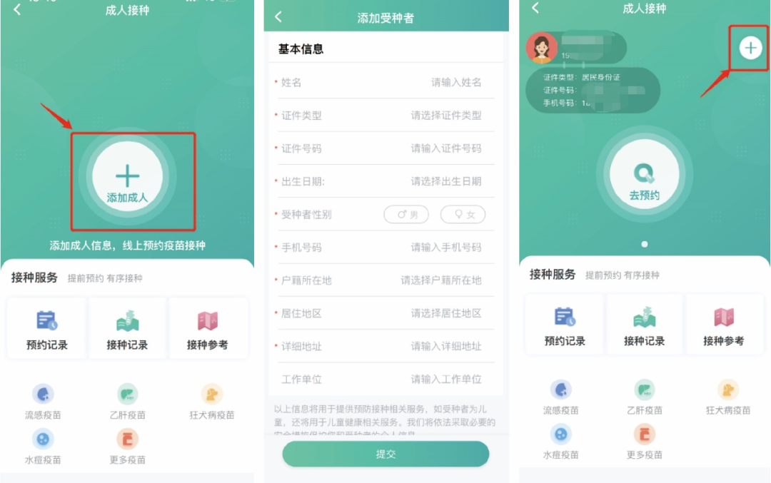 第一步 首次预约,需绑定受种者。点击成人接种页面上的“添加成人”进入添加受种者页面,填写基本信息后点击“提交”按钮。如需绑定多名成人,点击右上角“+”号即可绑定。