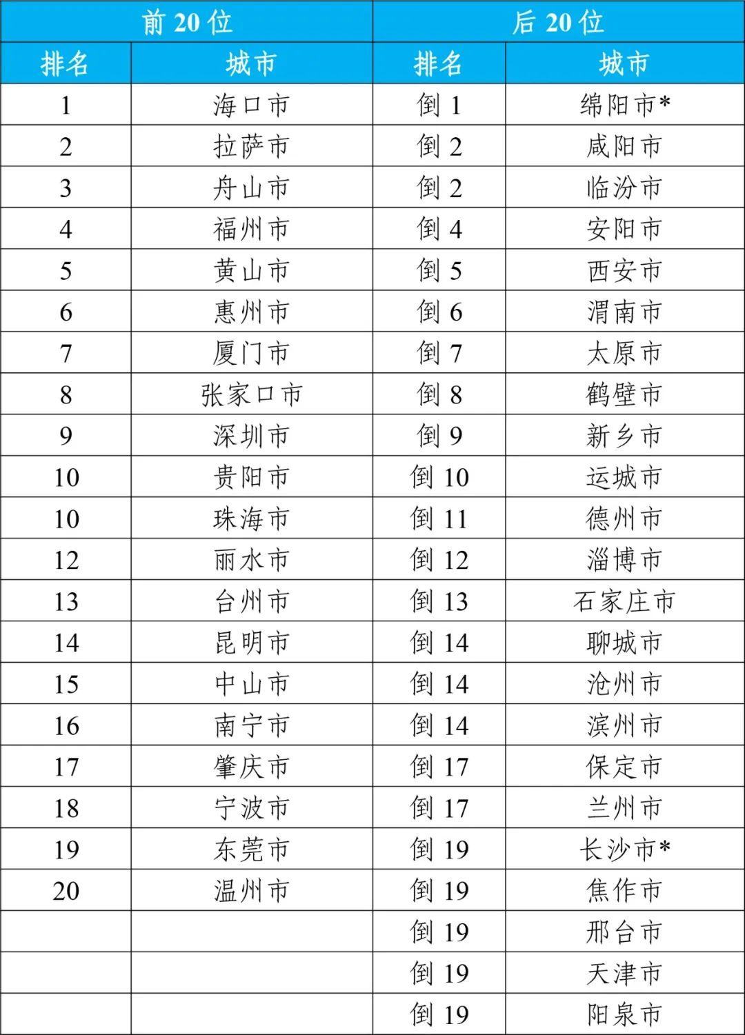 全国168个重点城市中:空气质量排名前20位城市依次是海口、拉萨和舟山等城市(从第1名至第20名);空气质量排名后20位城市依次是绵阳、咸阳和临汾等城市(从倒数第1名至并列倒数第19名)。空气质量变化排名前20位城市依次是漯河、驻马店和鹤壁等城市(从第1名至并列第20名);空气质量变化排名后20位城市依次是绵阳、长沙和南充等城市(从倒数第1名至倒数第20名)。其中,绵阳市科技城新区的高新区自来水公司站点4月和5月、长沙市开福区的伍家岭站点6月受到严重人为干扰,对所在城市当月六项污染物浓度进行了最大值替代处理。