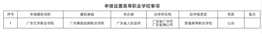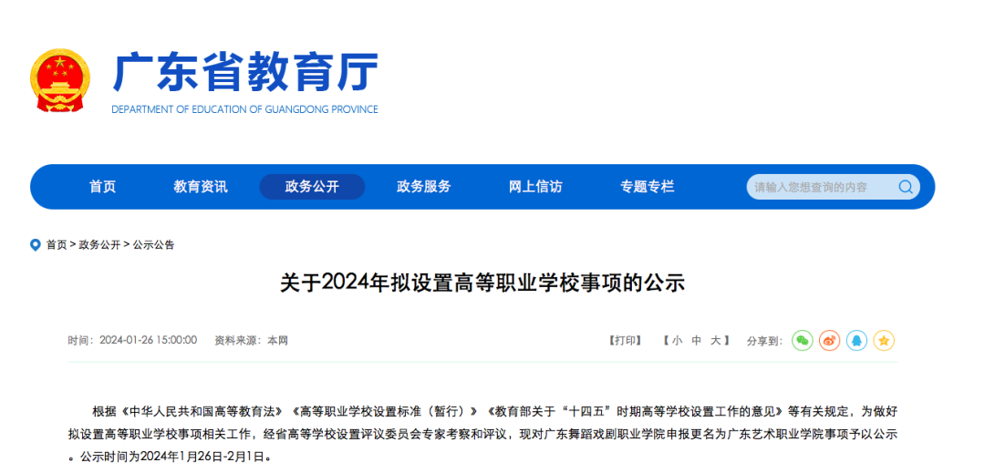 1月26日,广东省教育厅发布《关于2024年拟设置高等职业学校事项的公示》,经广东省高等学校设置评议委员会专家考察和评议,对广东舞蹈戏剧职业学院申报更名为广东艺术职业学院事项予以公示。公示时间为2024年1月26日-2月1日。