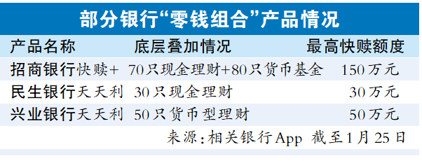 “新规”在防范风险的同时也限制了现金管理类产品的灵活性,对客户的吸引力迅速下降。为了突破大额申赎的痛点,部分银行推出“零钱组合”理财产品,依靠不断叠加底层产品数量的方式提升“快赎”额度。