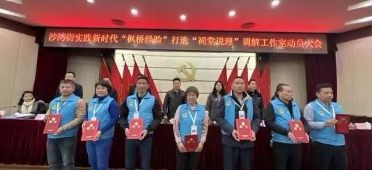 会上举行了沙湾街人民调解中心和福涌村、龙岐村、古坝东村、龙湾村、三善村、紫坭村、沙湾西村等7个行政村的“祠堂说理”调解工作室揭牌仪式,同时向7位全街首批“祠堂说理”主理员颁发了聘书,并邀请“祠堂说理”主理员代表张玉堂、梁洁玉结合自身经历作发言。