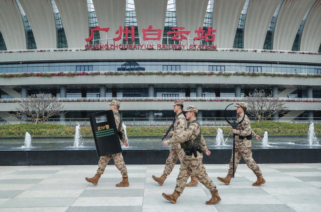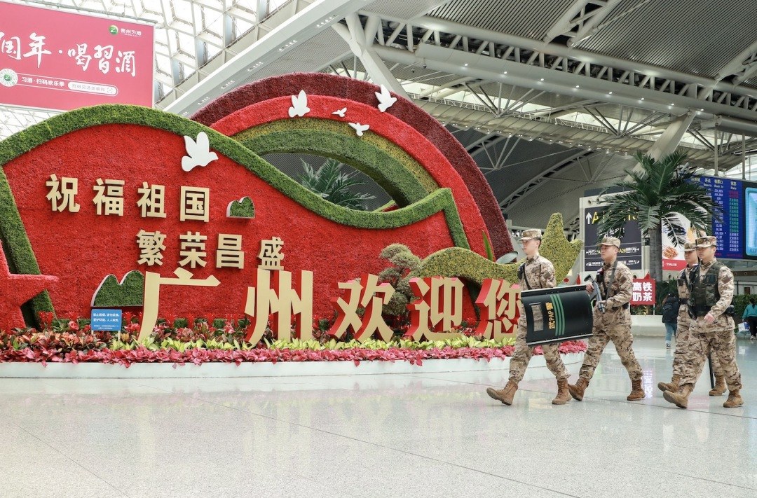在广州,武警广东总队广州支队执勤官兵坚守巡逻战位,担负火车站、客运站、机场等重点交通枢纽武装巡逻任务。执勤官兵们精神昂扬,守护旅客出行,无论是站台还是广场,那抹“橄榄绿”就是安全、踏实的象征。