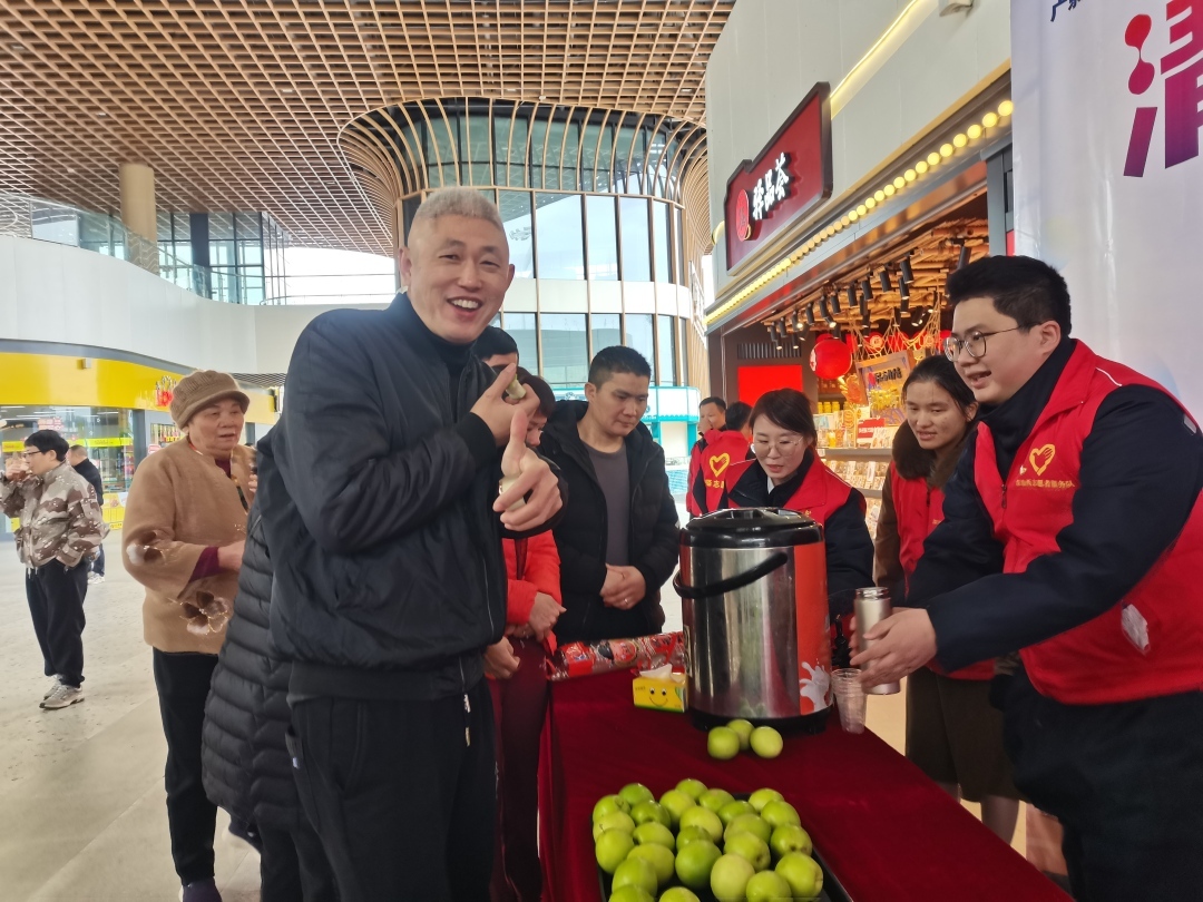 集市里,肇花高速和大塘镇志愿者为司乘详细讲解和介绍,同时提供热水姜茶、ETC咨询、知识宣传等服务。旅客刘女士现场购买了手作龟苓膏、腊味等,打算将其作为归乡小礼物。
