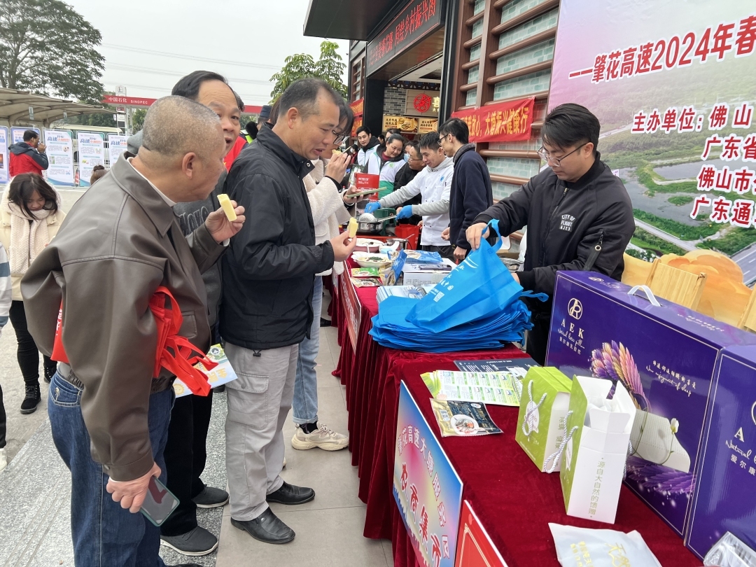“这是在高速公路服务区开设的‘农商集市’,利用这个开放的窗口,我们正在探索把助力乡村振兴发展和高速公路服务有效结合起来。”肇花高速负责人廖舜亭介绍。为助推“百千万工程”落地见效,展示传播佛山特色地方文化,春运首日,肇花高速联合沿线大塘镇政府、佛山高速交警以及通驿公司在大塘服务区举行了“共护至美肇花路、同绘乡村振兴图”主题实践活动,形成了企地联动护路促发展的乡村振兴新格局。
