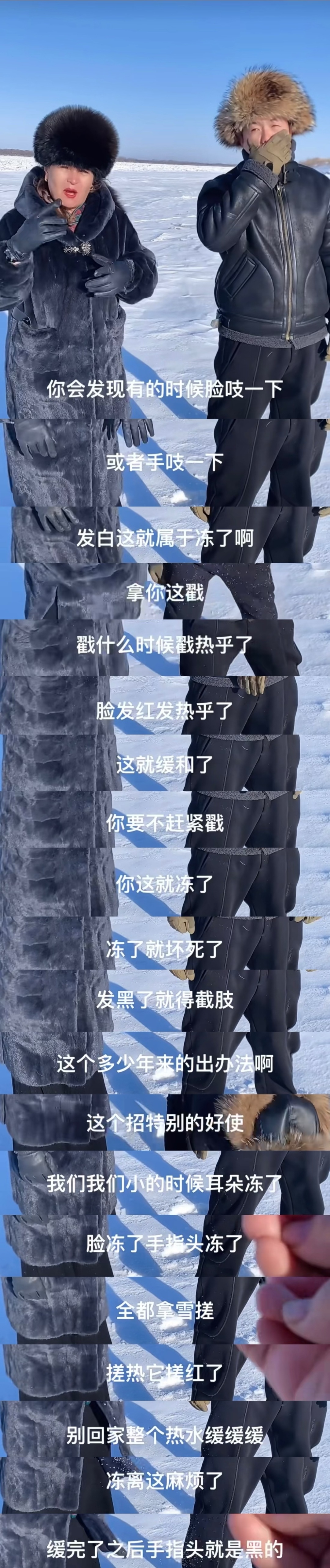 网上有东北博主分享当地人的“常识”:一旦在雪地里突然感觉到脸或者手指脚趾有“吱一下”的刺激性疼痛,或者发白,就要赶紧用雪搓,搓到看着红润了就好了,千万不能回家用热水泡缓,不然发黑就会面临截肢风险。