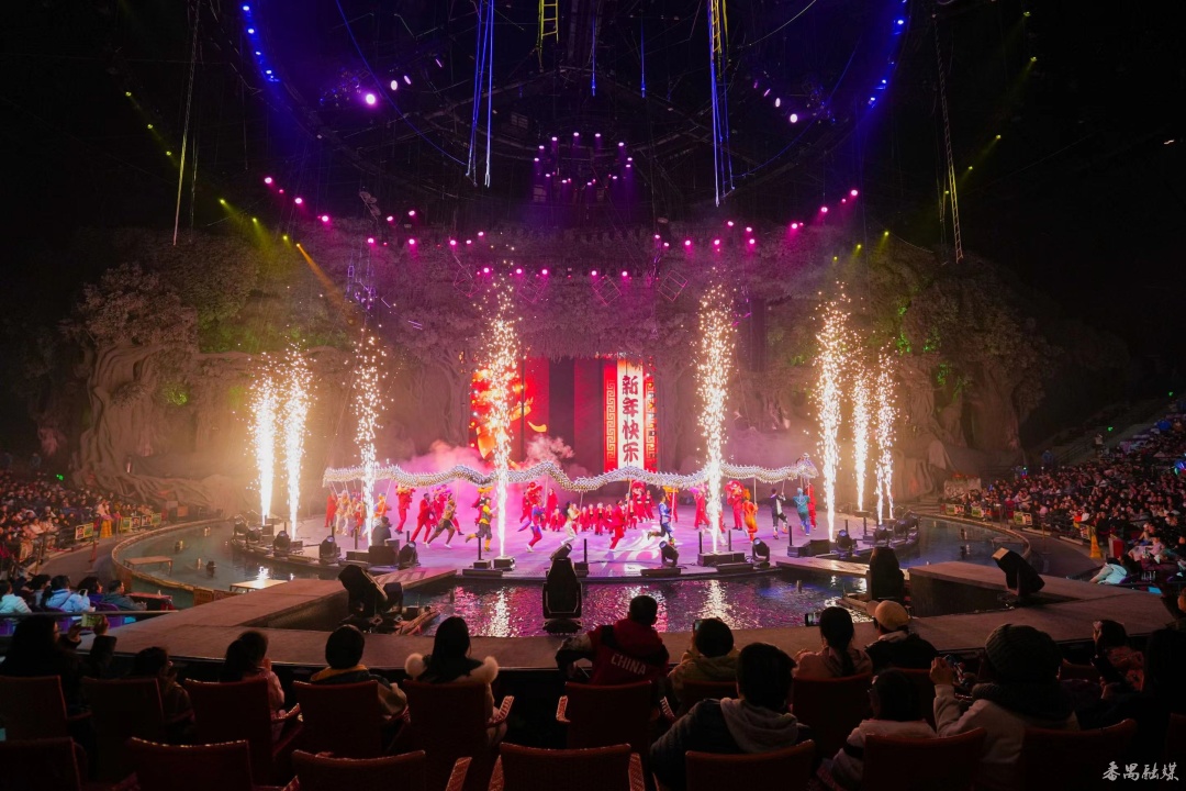 记者了解到,此次长隆国际大马戏特别打造龙年限定暖场节目,融合了世界元素和中国传统,春节氛围满满。耳熟能详的曲目《恭喜发财》开场,春节的喜庆氛围瞬间弥漫开来。随后的齐舞节目《金龙贺岁步步高》更是将现场气氛推向高潮,节目里来自23个国家的演员上演的中国传统节目舞龙更是让观众眼前一亮,引来现场观众连连惊叹。