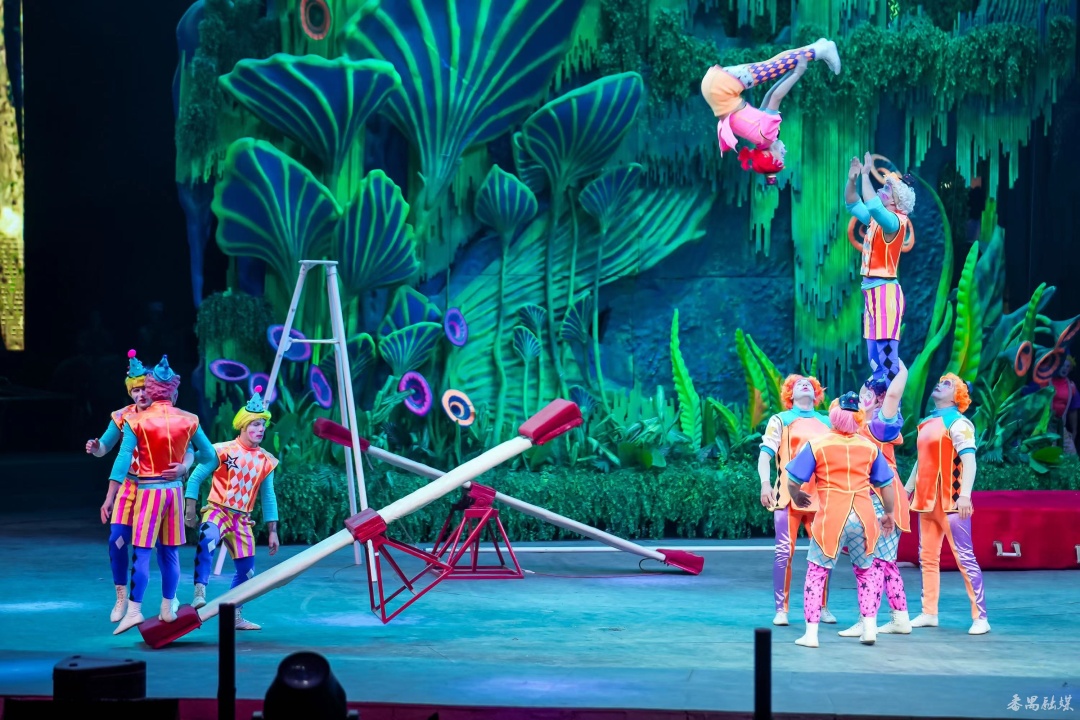 之后的暖场特别节目——演员们盛装齐跳网络热歌《科目三》,熟悉的前奏响起时,再次将现场观众的激情点燃,现场群情激昂,掌声和欢呼声此起彼伏。劲歌热舞过后,来自23个国家的马戏演员用中文向全场观众送上新年祝福,还有幸运观众受邀上舞台合照,场面热闹非凡。